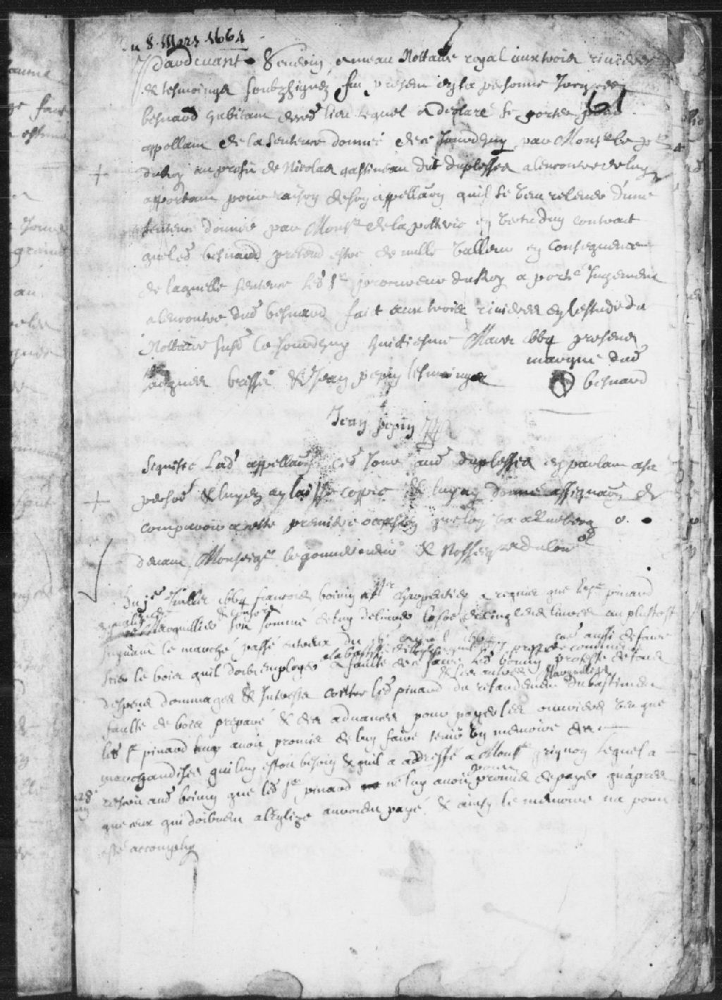 Le titre complet de la pièce se lit comme suit : Requête de François Boivin, maître charpentier, demandant que le sieur Pinard, en qualité de Marguillier, et consort, soit sommé de lui délivrer la somme de 500 livres au plus tôt, suivant le marché passé entre eux du 16 août 1664, faire scier le bois qu'il doit employer à la bâtisse de l'église; faute de ce faire ledit Boivin proteste de tous dépens, dommages et intérêts contre ledit Pinard et les autres marguilliers du retardement du bâtiment faute de bois préparé et des avances pour payer les ouvriers, vu que ledit Pinard lui avait promis de lui faire tenir un mémoire des marchandises et qu'il a adressé à monsieur Grignon, ce qui n'a pas été fait.