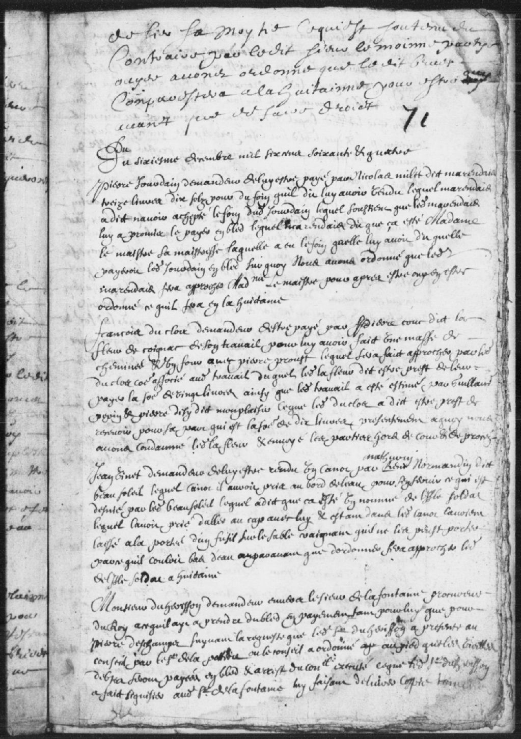 Requête de François du Clos (Duclos), demandeur, d'être payé par Pierre Couc dit la Fleur (Lafleur) de Coignac (Cognac) de son travail pour avoir fait une masse de cheminée et un four avec Pierre Proust, son associé; travail estimé par Guillaume Pépin et Pierre Disy (Dizy) dit Monplaisir à 20 livres; Couc est prêt à donner 10 livres à du Clos, condamné à payer ladite somme de 10 livres, envoyé les parties hors de cour et de procès, 6 décembre 1664, Archives nationales à Trois-Rivières, Fonds Juridiction royale des Trois-Rivières, (04T,TL3,S11,P892).