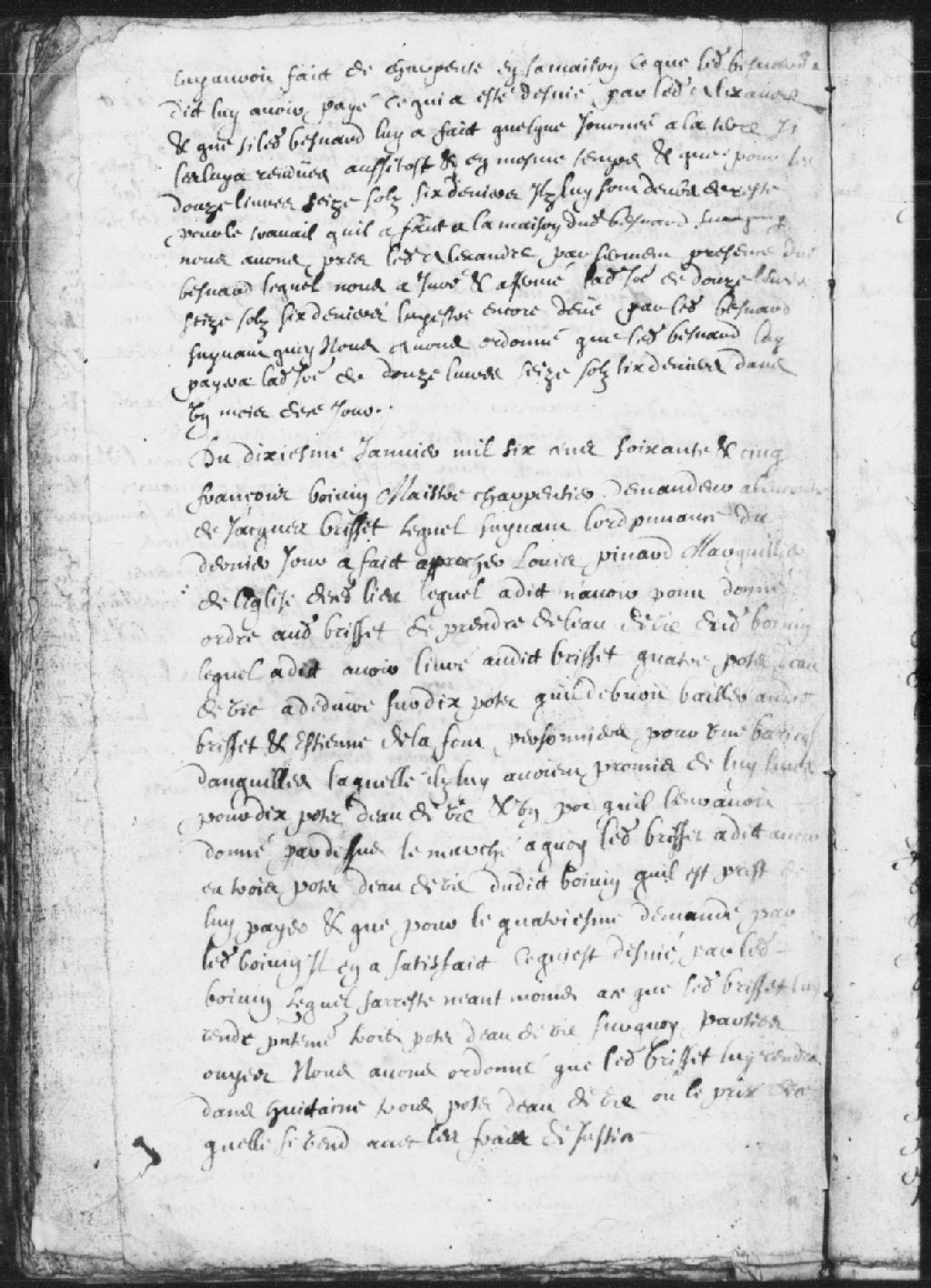 Témoignage de Louis Pinard, marguillier, dans la cause de François Boivin, maître charpentier, à l'encontre de Jacques Brisset; Pinard dit n'avoir donné aucun ordre à Brisset de prendre l'eau-de-vie (alcool) de Boivin; ordonné à Brisset de rendre dans huitaine 3 pots d'eau-de-vie ou leur valeur avec les frais de justice, 10 janvier 1665, Archives nationales à Trois-Rivières, Fonds Juridiction royale des Trois-Rivières, (04T,TL3,S11,P910).