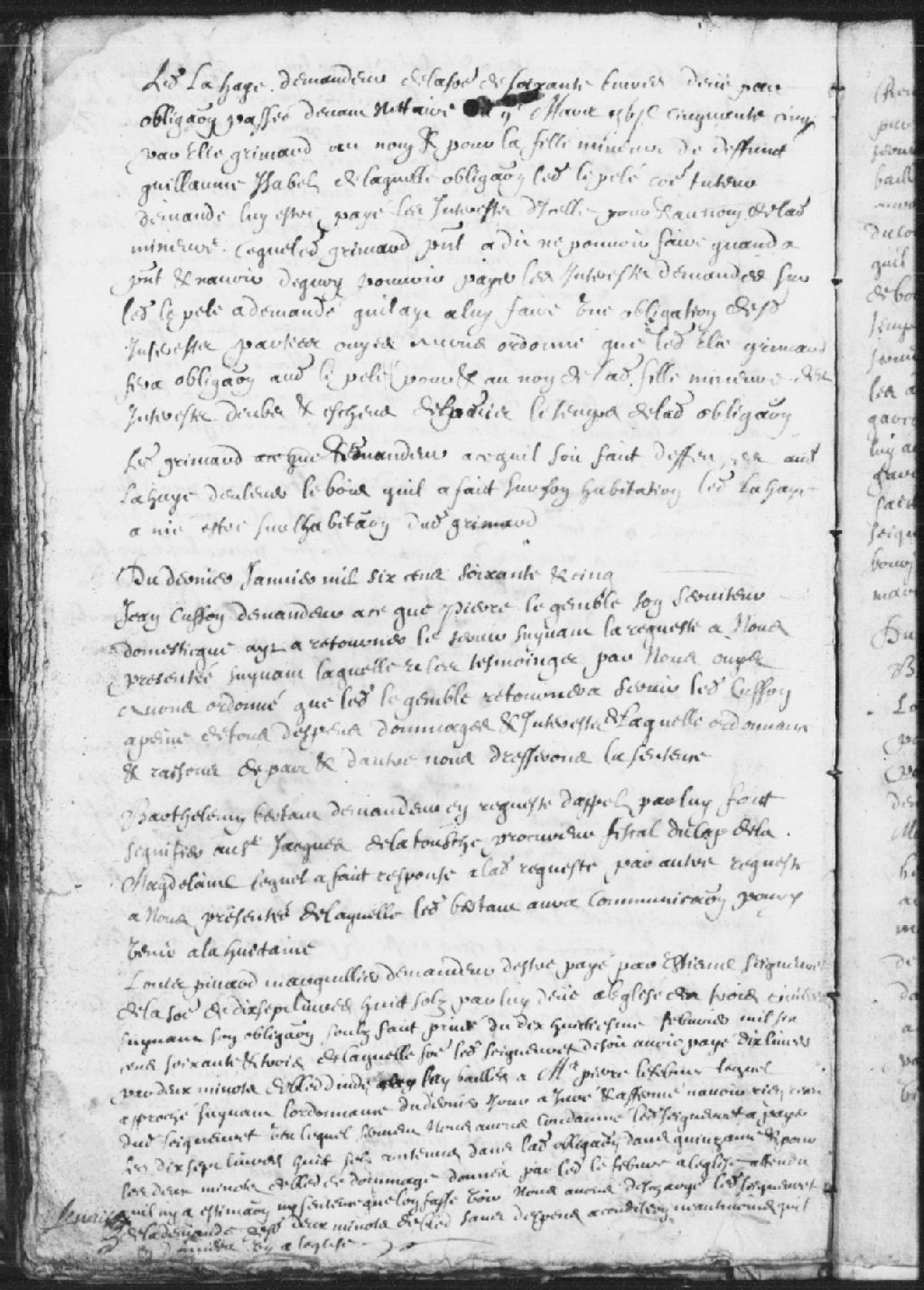 Requête dudit la Haye (Lahaye, Lahaie), demandeur, de la somme de 60 livres dues par obligation passée devant notaire le 9 mars 1655 par Élie Grimard au nom et pour la fille mineure de Guillaume Isabel, dont ledit le Pelé (Lepellé) est co-tuteur; Grimard n'a de quoi payer les intérêts; ordonné de faire une obligation au nom de ladite fille mineure pour lesdits intérêts dus et échus depuis le temps de ladite obligation