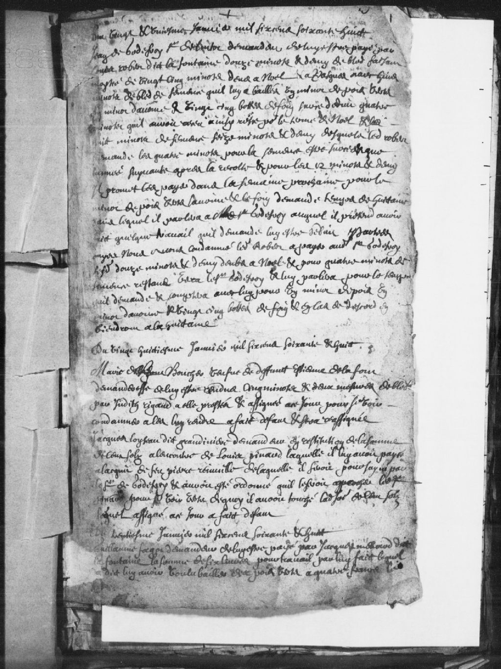 Comparution de Guillaume Fagot, demandeur, pour que lui soit payée par Jacques Ménard dit Lafontaine (La Fontaine), la somme de 6 livres pour un travail fait par lui. Ménard a voulu lui bailler des pois verts à quatre francs le minot en échange. Refusé et ledit Ménard obtient un mois pour payer la somme qui lui est ordonnée de verser en plus des frais de justice, 30 janvier 1668, Archives nationales à Trois-Rivières, Fonds Juridiction royale des Trois-Rivières, (04T,TL3,S11,P950).
