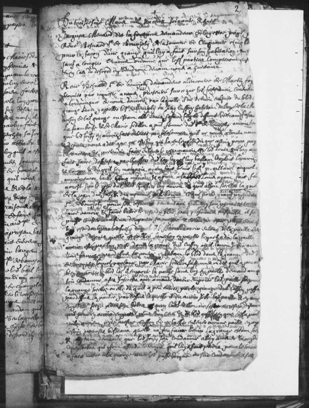 Requête faite par René Bénard (Besnard), sieur de Bourjoly, demandeur, parlant par sa femme Marie Sédilot (Sedillot), à l'encontre de Martin Foisy, son fermier, qui contrevient à l'ordonnance selon laquelle il ne devrait pas enlever du blé de la grange sans y appeler le sieur de Bourjoly ou Jean Cusson, habitant du Cap-de-la-Madeleine, voisin de ladite grange. Bourjoly obtient le droit de mettre 1 ou 2 hommes à battre avec Foisy pour surveiller ce dernier et éviter d'autres pertes, 3 mars 1668, Archives nationales à Trois-Rivières, Fonds Juridiction royale des Trois-Rivières, (04T,TL3,S11,P953).