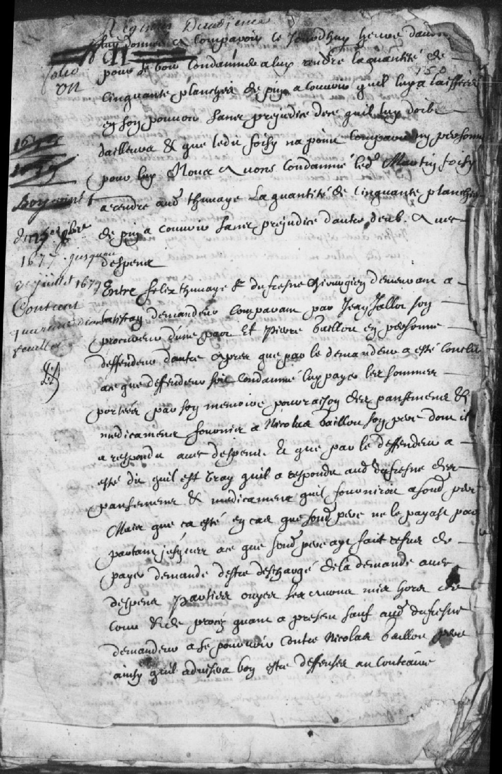 Informations permettant une mise en contexte du Registre no 4 des audiences de la Juridiction royale des Trois-Rivières (du 6 novembre 1673 au 6 novembre 1690), du 25 octobre 1677 au 3 juillet 1679, p. 150-233, 25 octobre 1677, Archives nationales à Trois-Rivières, Fonds Juridiction royale des Trois-Rivières, (04T,TL3,S11,PDE).