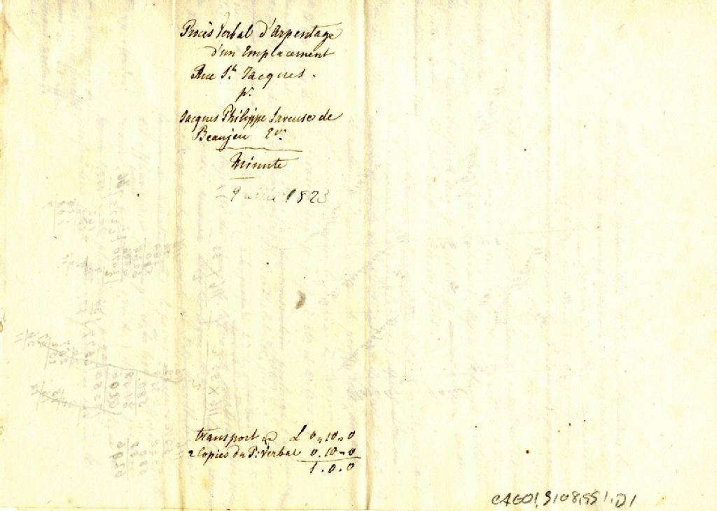 Procès-verbal d'arpentage d'un emplacement situé sur la rue Saint-Jacques à Montréal et appartenant à Jacques-Philippe Saveuse de Beaujeu, 29 avril 1823, Archives nationales à Montréal, Fonds Cour supérieure. District judiciaire de Montréal. Greffes d'arpenteurs, (06M,CA601,S108,SS1,D1).