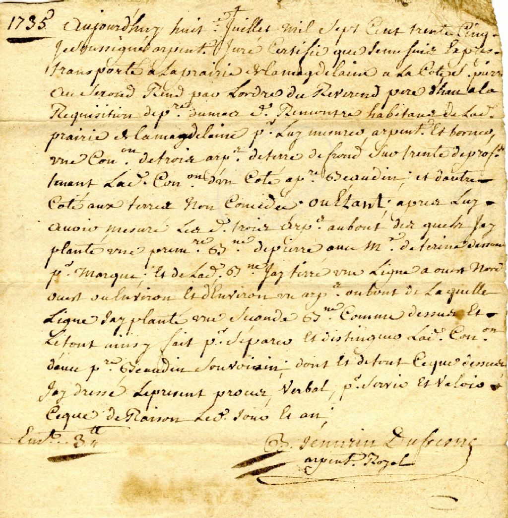 Procès-verbal d'arpentage, de mesurage et de bornage, par ordre du père d'Heu et à la requête de Pierre Dumas, d'un emplacement situé sur le 2e rang de la Côte Saint-Pierre à Laprairie de la Magdelaine, 8 juillet 1735, Archives nationales à Montréal, Fonds Cour supérieure. District judiciaire de Montréal. Greffes d'arpenteurs, (06M,CA601,S13,SS1,D15).