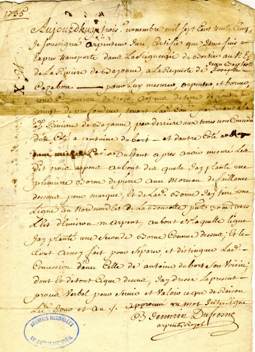 Procès-verbal d'arpentage, de mesurage et de bornage, à la requête de Jean Baptiste Casabon, d'une concession située dans la seigneurie de Berthier au Nord-Est de la rivière Bayonne, 3 novembre 1735, Archives nationales à Montréal, Fonds Cour supérieure. District judiciaire de Montréal. Greffes d'arpenteurs, (06M,CA601,S13,SS1,D16).
