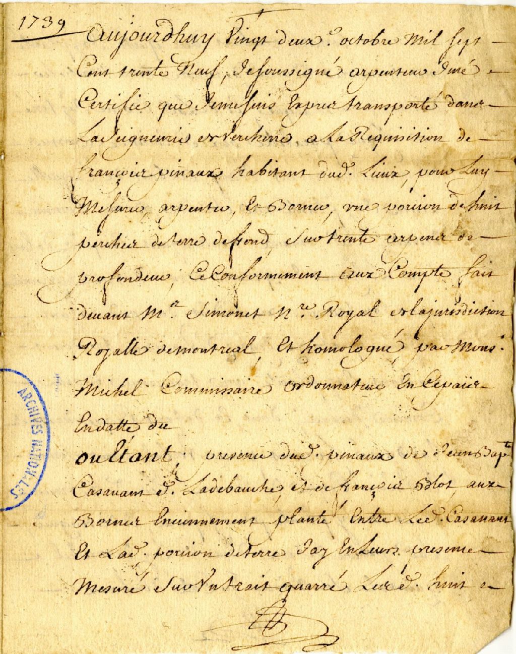 Procès-verbal d'arpentage, de mesurage et de bornage, à la requête de François Pinaux, d'un emplacement situé dans la seigneurie de Verchères, 22 octobre 1739, Archives nationales à Montréal, Fonds Cour supérieure. District judiciaire de Montréal. Greffes d'arpenteurs, (06M,CA601,S13,SS1,D21).