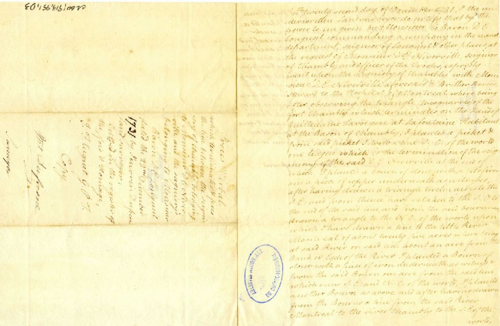 Procès-verbal de mesurage et de bornage entre la seigneurie de Chambly appartenant à Monsieur de Niverville et la seigneurie appartenant au baron de Longueuil, 22 décembre 1731, Archives nationales à Montréal, Fonds Cour supérieure. District judiciaire de Montréal. Greffes d'arpenteurs, (06M,CA601,S13,SS1,D3).