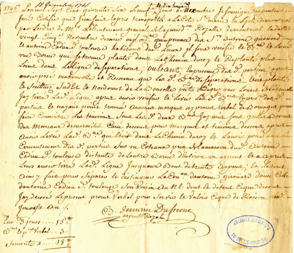 Procès-verbal de vérification d'un bornage, en vertu de l'ordre du lieutenant-général de la juridiction royale de Montréal et en présence d'Antoine Girouard et d'Antoine Cadieu dit Toulouse, d'un emplacement situé à la côte Sainte-Marie sur l'Île de Montréal, 9 décembre 1746-18 décembre 1746, Archives nationales à Montréal, Fonds Cour supérieure. District judiciaire de Montréal. Greffes d'arpenteurs, (06M,CA601,S13,SS1,D30).