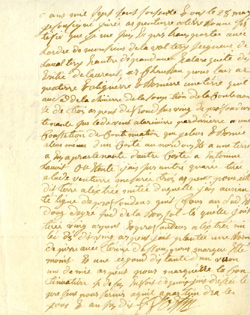 Procès-verbal de bornage, en vertu d'un ordre de Monsieur de Lavaltrie, seigneur de Lavaltrie, et à la requête des héritiers de Laurent Archambau, d'une terre située au Sud de la rivière L'Assomption