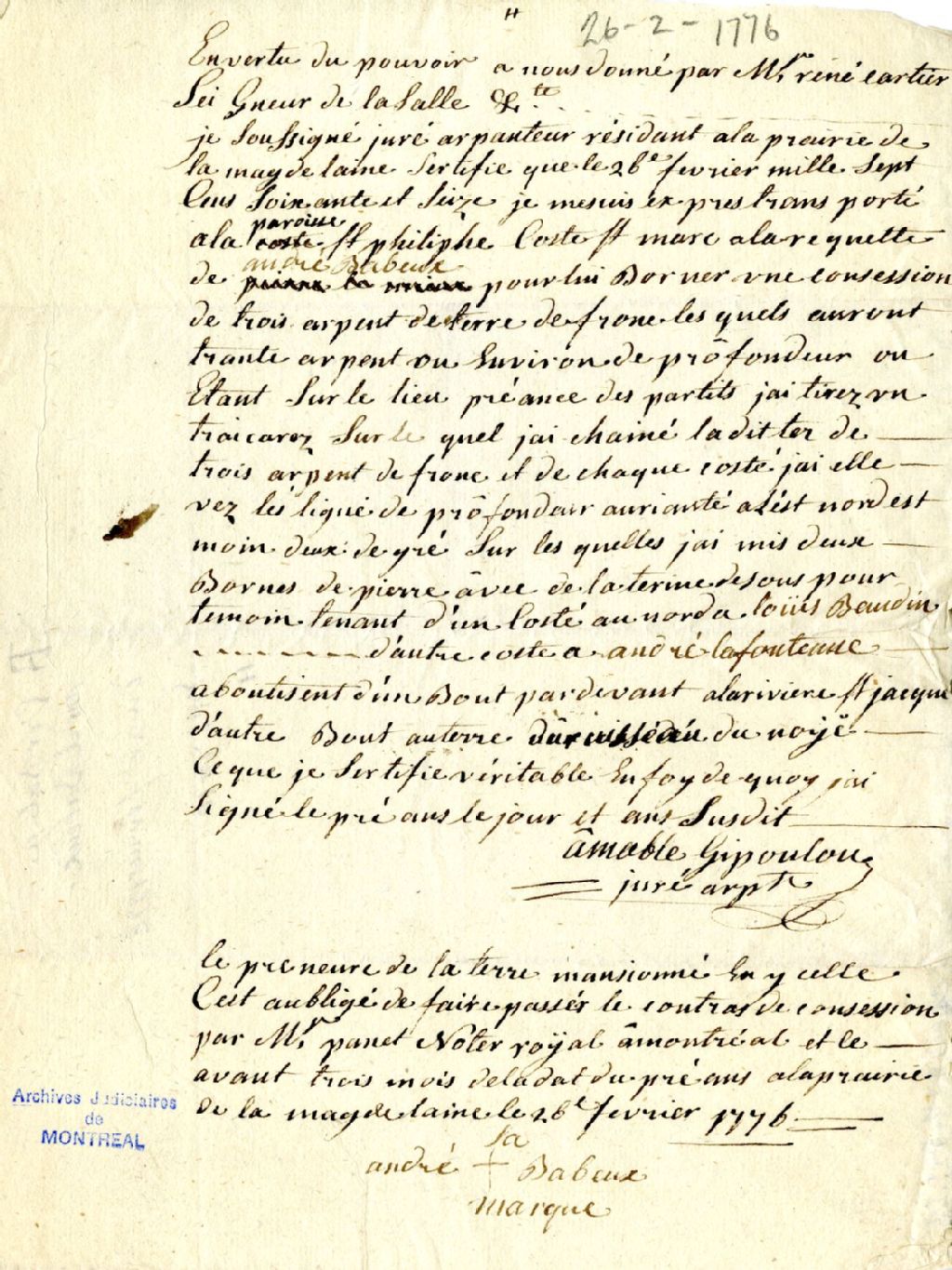 Procès-verbal de bornage, en vertu du pouvoir conféré par René Cartier, seigneur de Lasalle et à la requête d'André Babeux, d'une concession située à la côte Saint-Marc dans la paroisse de Saint-Philippe, 26 février 1776, Archives nationales à Montréal, Fonds Cour supérieure. District judiciaire de Montréal. Greffes d'arpenteurs, (06M,CA601,S27,SS1,D1).