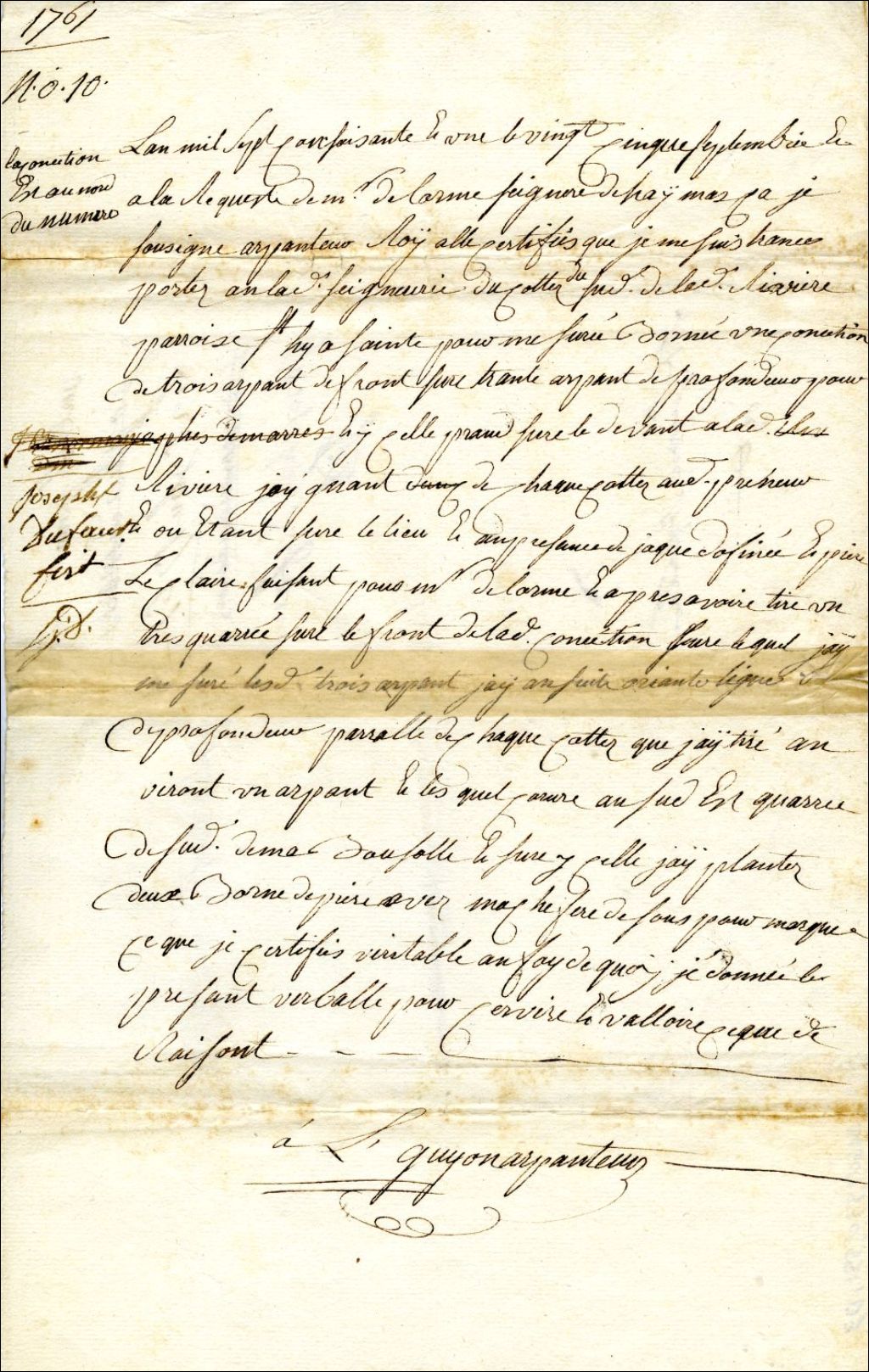 Procès-verbal de bornage, à la requête de M. Delorme et pour Joseph Dufaust, d'un emplacement situé au Sud de la rivière Yamaska dans la paroisse de Saint-Hyacinthe, 25 septembre 1761, Archives nationales à Montréal, Fonds Cour supérieure. District judiciaire de Montréal. Greffes d'arpenteurs, (06M,CA601,S30,SS1,D3).