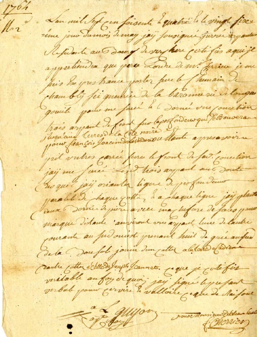 Procès-verbal de bornage, pour François Joachim Laverdure, d'une concession située sur le chemin de Chambly dans la seigneurie de Longueuil, 26 mai 1764, Archives nationales à Montréal, Fonds Cour supérieure. District judiciaire de Montréal. Greffes d'arpenteurs, (06M,CA601,S30,SS1,D5).