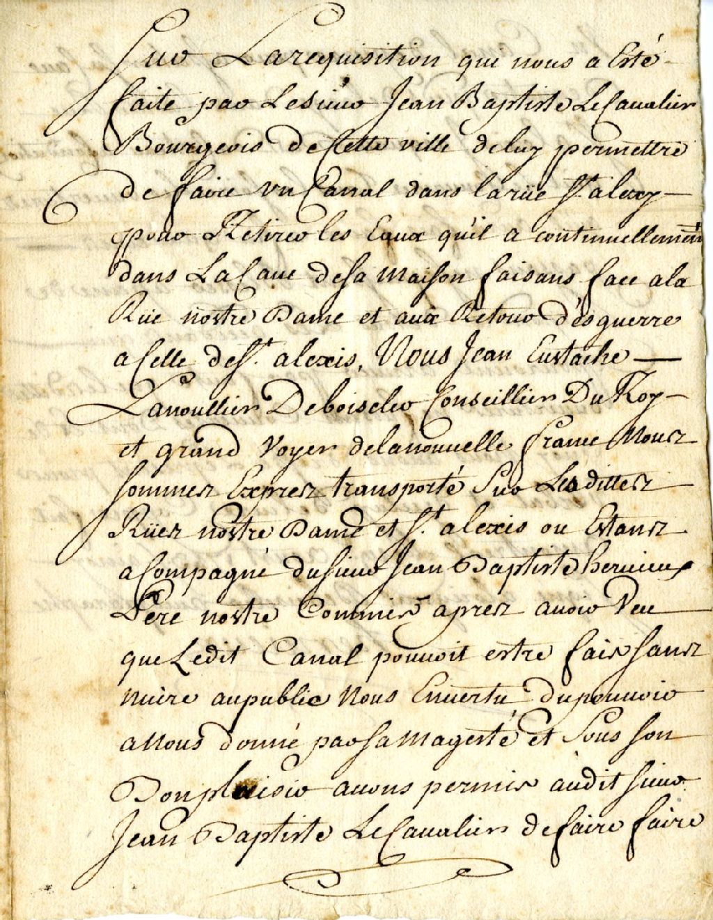 Procès-verbal, en vertu de l'autorisation de Jean-Eustache Lanouillier de Boisclerc, conseiller du Roi et grand voyer de la Nouvelle-France et à la requête de Jean Baptiste LeCavalier, demandant la permission de faire construire un canal sur la rue Saint-Alexis à l'angle de la rue Notre-Dame à Montréal, 19 août 1743, Archives nationales à Montréal, Fonds Cour supérieure. District judiciaire de Montréal. Greffes d'arpenteurs, (06M,CA601,S32,SS1,D2).