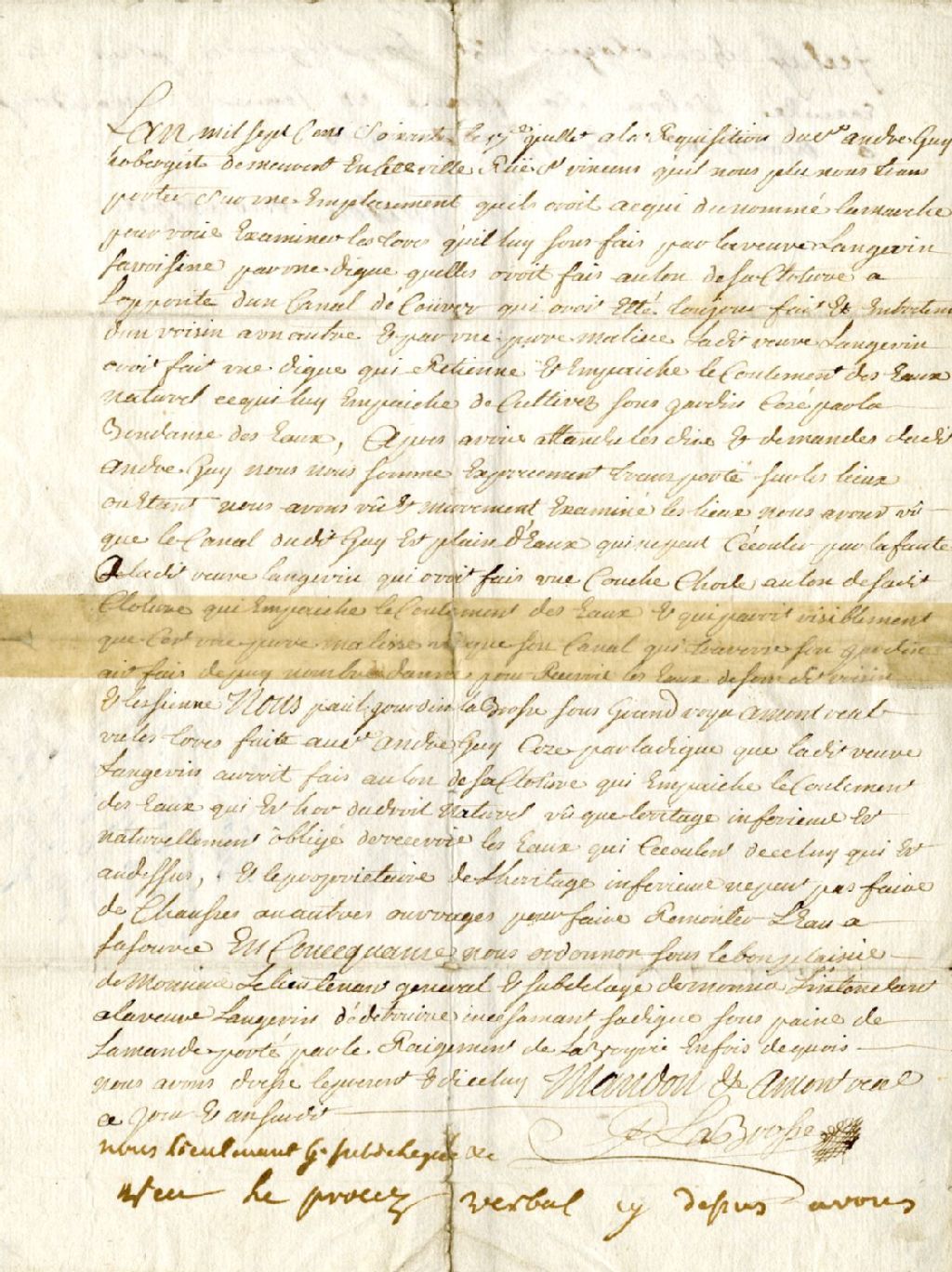 Procès-verbal, à la requête d'André Guy, aubergiste, sur un emplacement acquis d'un dénommé Lamarche relativement à l'écoulement des eaux d'un canal entre le terrain de la veuve Langevin et celui du requérant sur la rue Saint-Vincent à Montréal