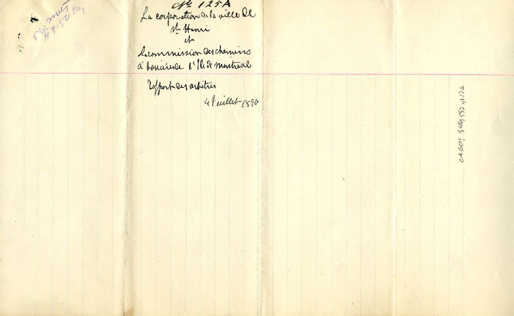Rapport soumis concernant l'état de la rue Notre-Dame à Montréal après la réalisation des travaux de canalisation, 4 juillet 1890, Archives nationales à Montréal, Fonds Cour supérieure. District judiciaire de Montréal. Greffes d'arpenteurs, (06M,CA601,S40,SS2,D126).