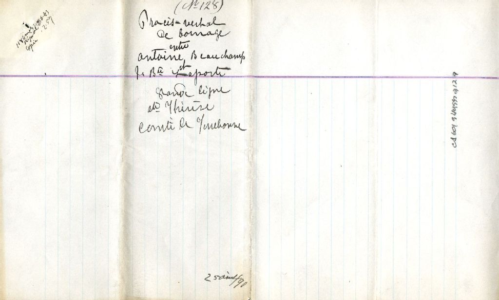 - Procès-verbal de bornage, à la requête d'Antoine Beauchamp, maçon, et à la suite du consentement de J. Bte Laporte, cultivateur, tous deux de la paroisse de Sainte-Thérèse-de-Blainville, pour établir la ligne de division de leurs terrains situés dans la concession de la Grande Ligne de la dite paroisse