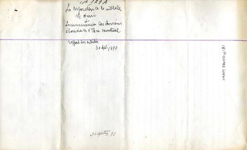 Rapport soumis à L. Hy. Sénécal, secrétaire de la Commission des chemins à barrières de l'île de Montréal et à A. Désiré, junior, secrétaire-trésorier de la ville de Saint-Henri, concernant les travaux d'asphaltage de la rue Notre-Dame depuis l'avenue Atwater jusqu'à la barrière au pied de la côte des Tanneries, 30 septembre 1890, Archives nationales à Montréal, Fonds Cour supérieure. District judiciaire de Montréal. Greffes d'arpenteurs, (06M,CA601,S40,SS2,D131).