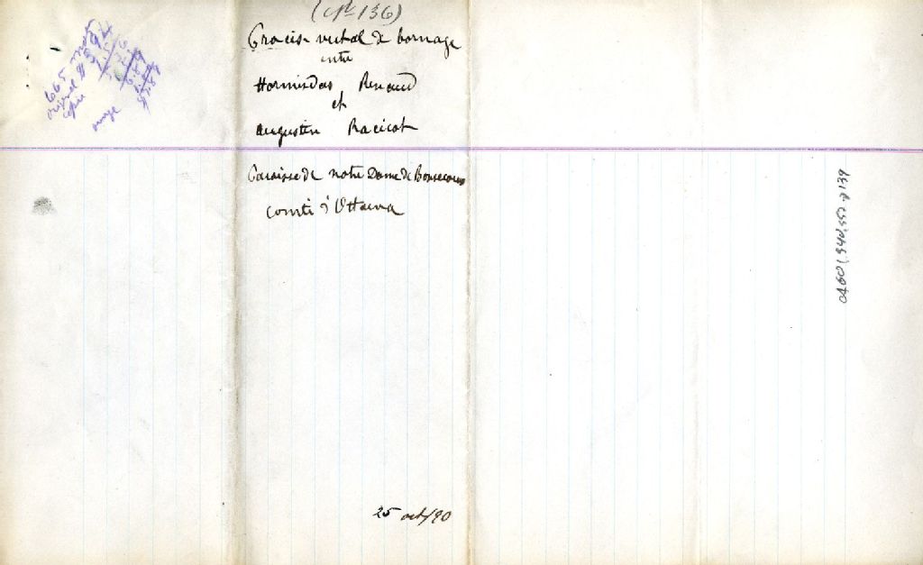 Procès-verbal de bornage, à la requête d'Hormisdas Renaud et à la suite du consentement d'Augustin Racicot, tous deux cultivateurs de la paroisse de Notre-Dame-de-Bonsecours, pour établir la ligne de division de leurs terrains situés dans le rang du Front de la seigneurie de la Petite-Nation de la dite paroisse, 25 octobre 1890, Archives nationales à Montréal, Fonds Cour supérieure. District judiciaire de Montréal. Greffes d'arpenteurs, (06M,CA601,S40,SS2,D139).