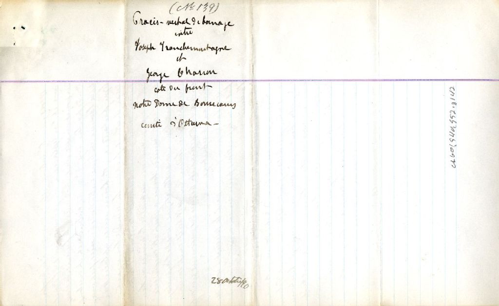 Procès-verbal de bornage, à la requête de Joseph Tranchemontagne et Georges Charron, tous deux cultivateurs de la paroisse de Notre-Dame-de-Bonsecours, pour établir la ligne de division de leurs terrains situés dans la côte du Front de la dite paroisse, 28 octobre 1890, Archives nationales à Montréal, Fonds Cour supérieure. District judiciaire de Montréal. Greffes d'arpenteurs, (06M,CA601,S40,SS2,D142).