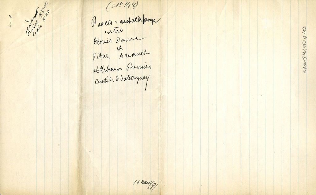 - Procès-verbal de bornage, à la requête de Clovis Dame, cordonnier, et à la suite du consentement de Vital Breault, cultivateur, tous deux de la paroisse de Saint-Urbain-Premier, pour établir la ligne de division de leurs terrains situés dans la dite paroisse
