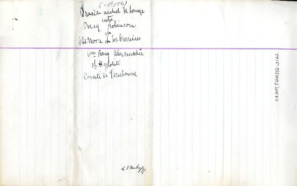 Procès-verbal de bornage, à la requête de Percy Robinson, cultivateur de la paroisse de Saint-Jérôme, et à la suite du consentement de Charles Moore et Joseph Carrières, tous deux cultivateurs de la paroisse de Saint-Hypolite, pour établir la ligne de division entre leurs terrains situés dans le 6e Rang du canton d'Abercrombie, 23 décembre 1891, Archives nationales à Montréal, Fonds Cour supérieure. District judiciaire de Montréal. Greffes d'arpenteurs, (06M,CA601,S40,SS2,D162).