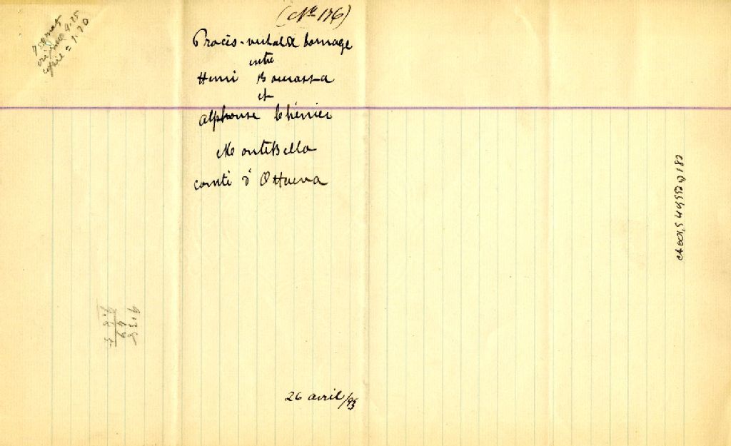 Procès-verbal de bornage, à la requête d'Henri Bourassa, gentilhomme, et à la suite du consentement d'Alphonse Chénier, cultivateur, tous deux du village de Montebello, dans la paroisse de Notre-Dame-de-Bonsecours, pour établir la ligne de division de leurs terrains situés dans le dit lieu, 26 avril 1893, Archives nationales à Montréal, Fonds Cour supérieure. District judiciaire de Montréal. Greffes d'arpenteurs, (06M,CA601,S40,SS2,D182).