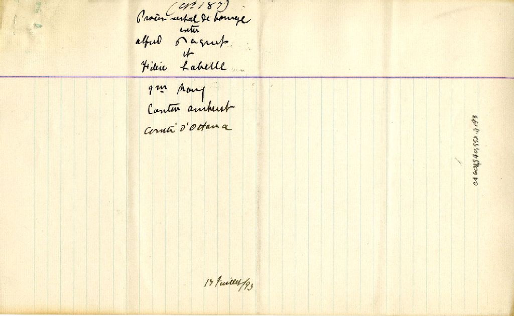 Procès-verbal de bornage, à la requête d'Alfred Paquet et à la suite du consentement de Félix Labelle, tous deux cultivateurs du canton d'Amherst dans la paroisse de Saint-Rémi-d'Amherst, pour établir la ligne de division de leurs terrains situés dans le 9e Rang du dit canton, 17 juillet 1893, Archives nationales à Montréal, Fonds Cour supérieure. District judiciaire de Montréal. Greffes d'arpenteurs, (06M,CA601,S40,SS2,D193).