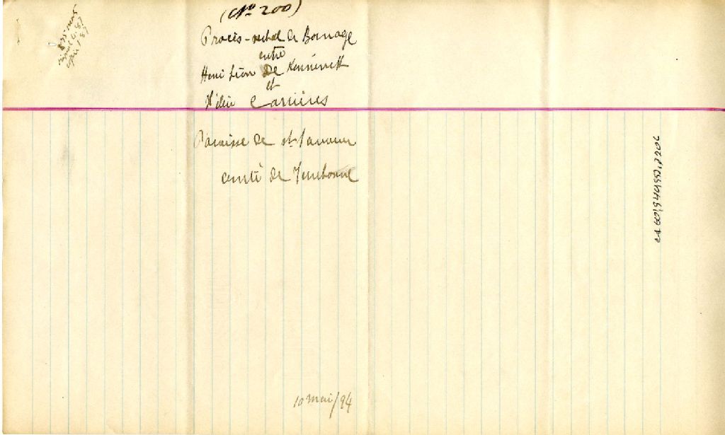Procès-verbal de bornage, à la requête d'Henri Léon de Konninck lieutenant de police de Montréal, et à la suite du consentement de Félix Carrières, cultivateur de la paroisse de Saint-Sauveur, pour établir la ligne de division de leurs terrains situé à la concession Est de la rivière du Nord dans la dite paroisse, 10 mai 1894, Archives nationales à Montréal, Fonds Cour supérieure. District judiciaire de Montréal. Greffes d'arpenteurs, (06M,CA601,S40,SS2,D206).