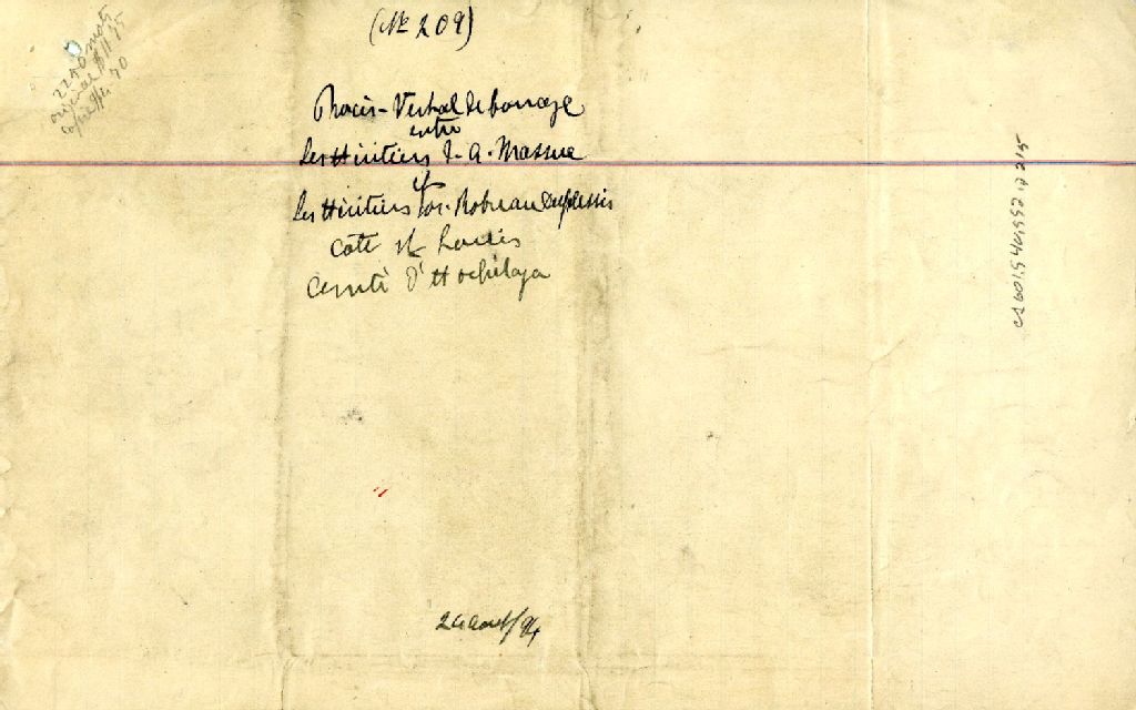 - Procès-verbal de bornage et plan, à la requête de Zéphirin Resther, architecte de Montréal, en sa qualité d'exécuteur testamentaire de Joseph Aimé Massue, et des héritiers de Joseph Robreau Duplessis, représentés par Louis Jean Baptiste Martin, Léa Cardinal (veuve de Joseph Urbain Turcot), Marie Anne Turcot (épouse de Bazile Pesant) et le dit Bazile Pesant, pour établir la ligne de division de leurs terrains situés au village de la Côte-Saint-Louis et portant les n° 325 et 326