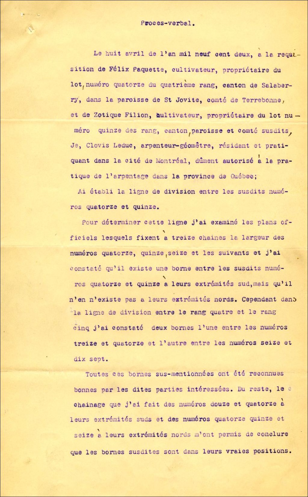 Procès-verbal de bornage, à la requête de Félix Paquette et Zotique Filion, cultivateurs de la paroisse de Saint-Jovite, pour établir la ligne de division entre leurs propriétés portant les n° 14 et 15 de la paroisse de Saint-Jovite