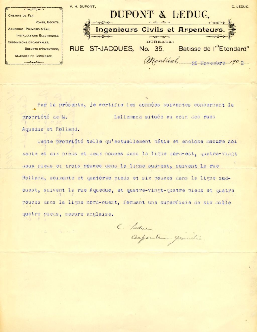 Certificat de mesurage de la propriété de Monsieur Lallemand située à l'angle des rues Aqueduc et Rolland à Montréal, 21 novembre 1902, Archives nationales à Montréal, Fonds Cour supérieure. District judiciaire de Montréal. Greffes d'arpenteurs, (06M,CA601,S41,SS1,D28).