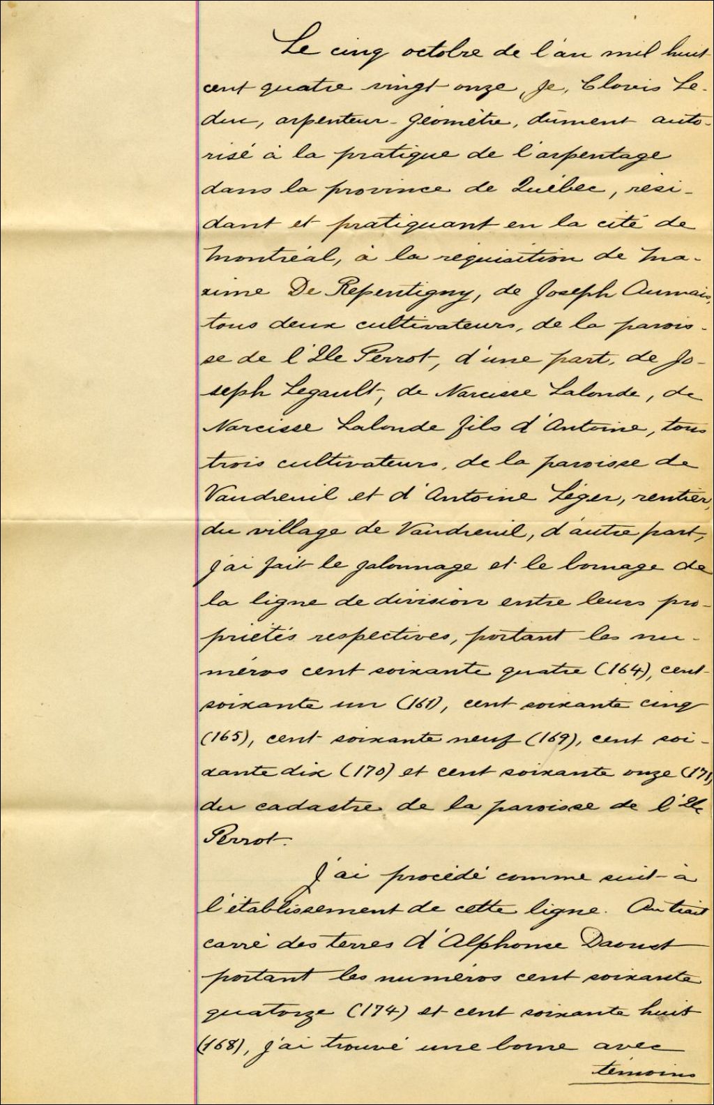 Procès-verbal de bornage, à la requête de Maxime de Repentigny et de Joseph Aumais, cultivateurs de la paroisse de l'Île-Perrot, d'une part, et de Joseph Legault et Narcisse (fils d'Antoine) Lalonde, cultivateurs de la paroisse de Vaudreuil, et d'Antoine Léger, rentier du village de Vaudreuil, d'autre part, pour établir la ligne de division entre leurs propriétés respectives portant les n° 164, 161, 169, 170 et 171 de la paroisse de l'Île-Perrot