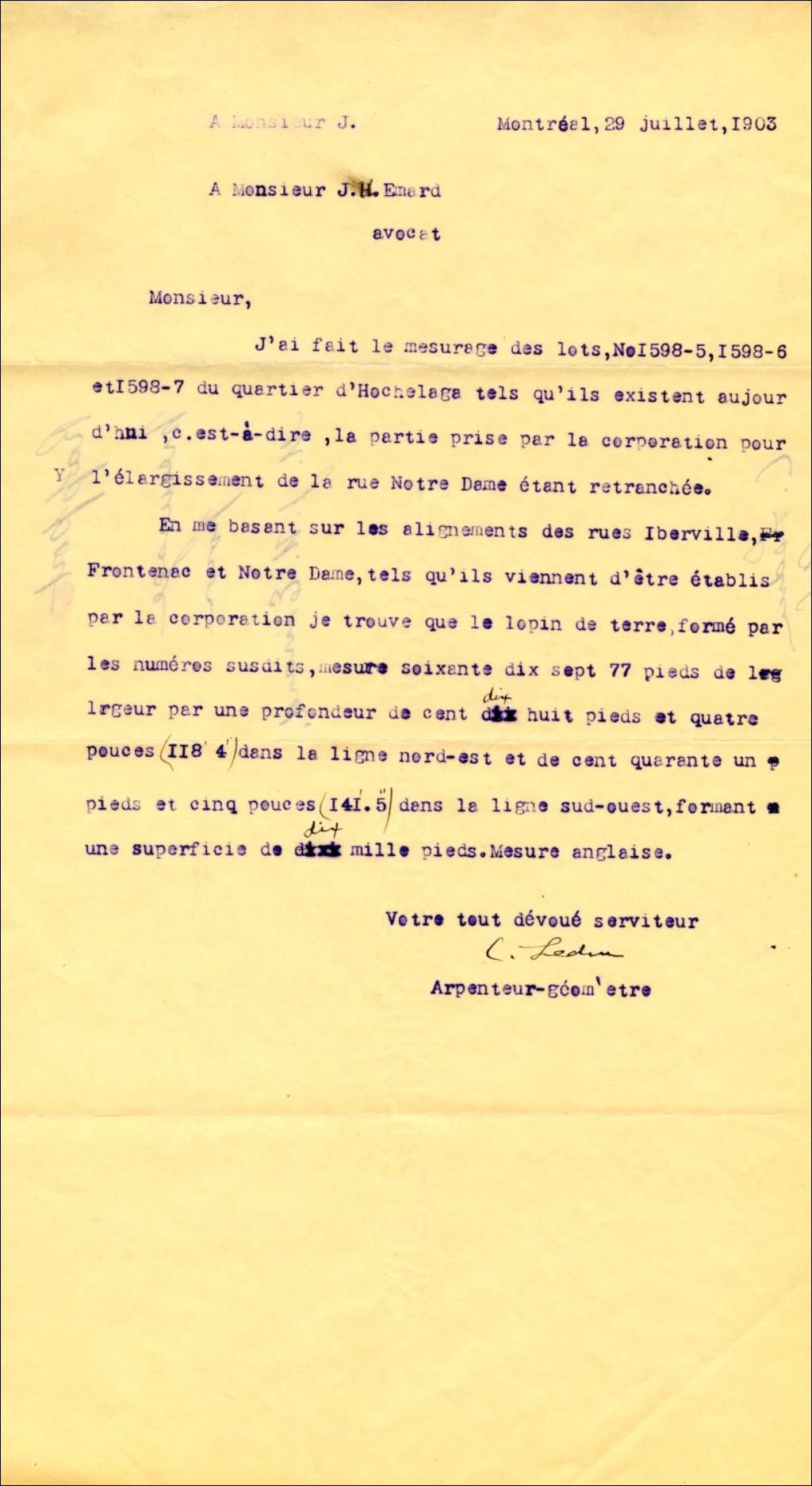 Rapport de Clovis Leduc à l'avocat J.H. Émard à propos du mesurage des lots n° 1598-5, 1598-6 et 1598-7 du quartier Hochelaga de Montréal pour l'élargissement de la rue Notre-Dame, 29 juillet 1903, Archives nationales à Montréal, Fonds Cour supérieure. District judiciaire de Montréal. Greffes d'arpenteurs, (06M,CA601,S41,SS1,D32).