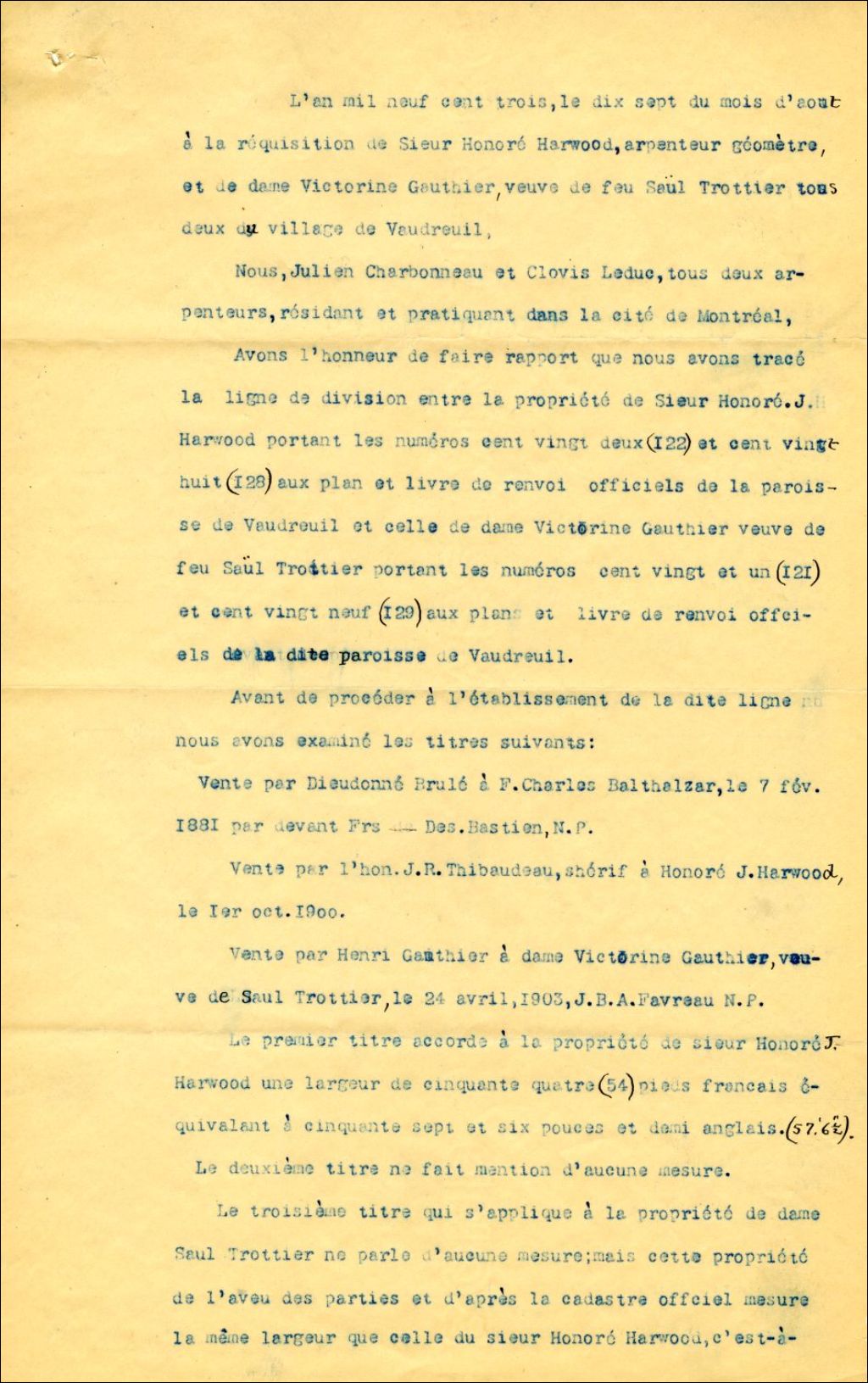 Procès-verbal de bornage, à la requête de sieur Honoré Harwood, arpenteur géomètre, et de Victorine Gauthier, veuve de Saül Trottier, tous deux du village de Vaudreuil, pour établir la ligne de division entre leurs propriétés portant les n° 122 et 128 et 121 et 129 de la paroisse de Vaudreuil