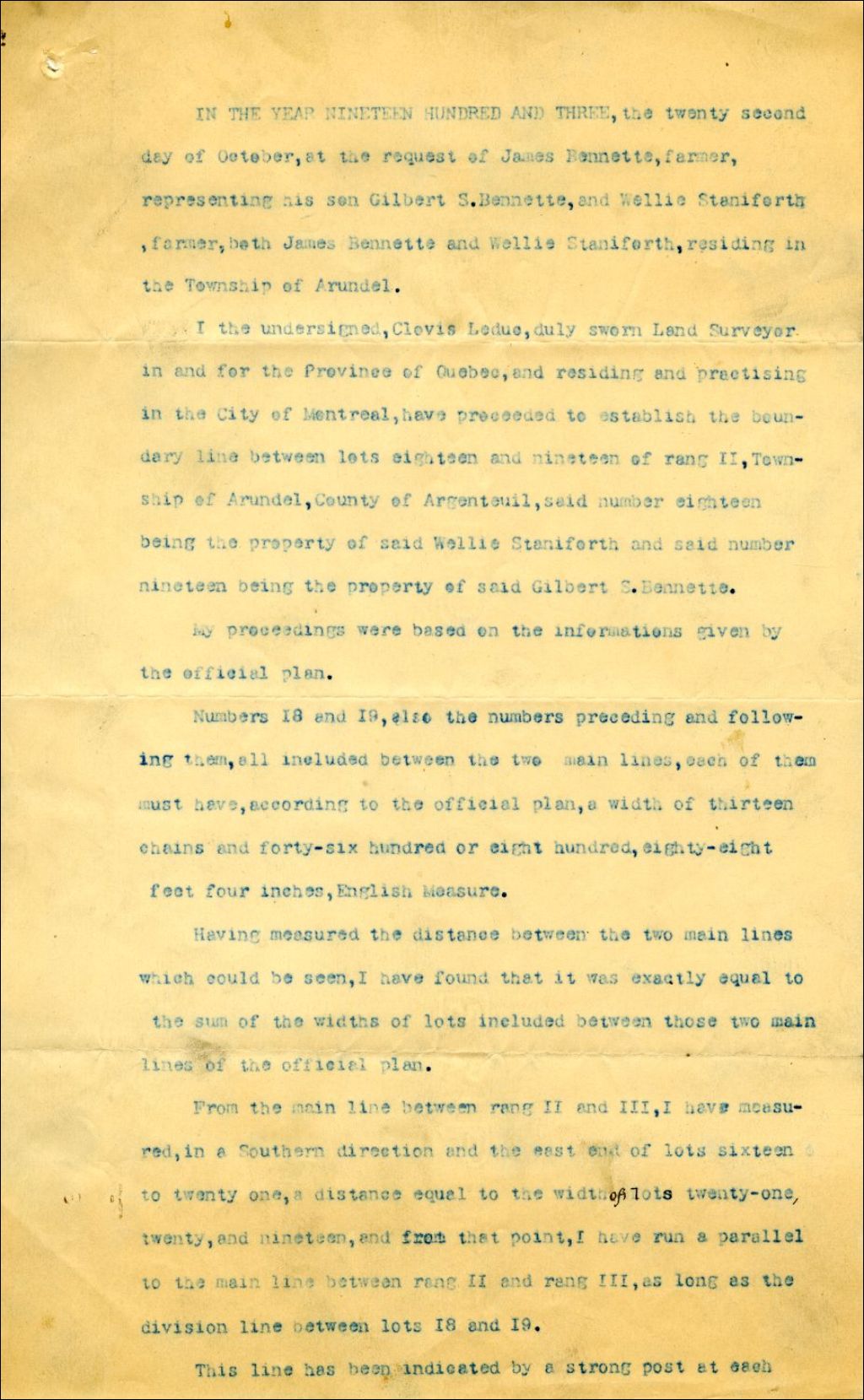 Procès-verbal de bornage, à la requête de James Bennette, représentant son fils Gilbert S. Bennette, et Wellis Staniforth, cultivateurs du canton d'Arundel, pour établir la ligne de division entre leurs propriétés portant les n° 18 et 19 du 2e rang du canton d'Arundel dans le comté d'Argenteuil, 2 octobre 1903, Archives nationales à Montréal, Fonds Cour supérieure. District judiciaire de Montréal. Greffes d'arpenteurs, (06M,CA601,S41,SS1,D35).