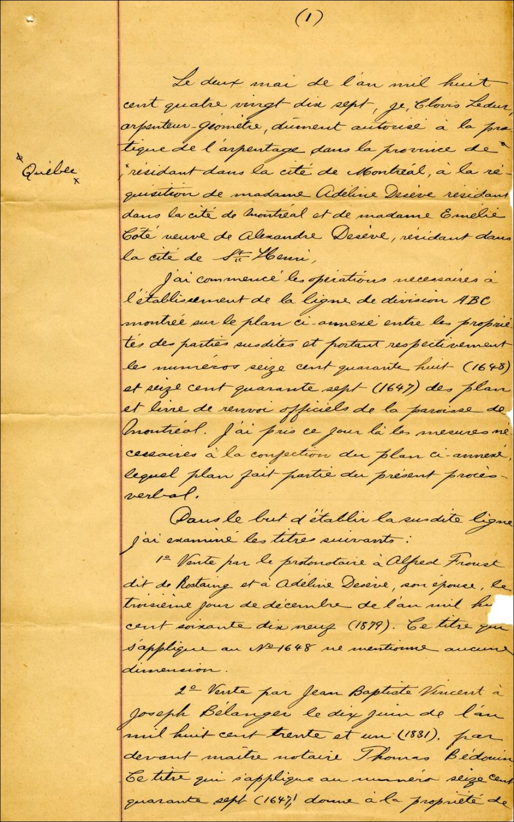 Procès-verbal de bornage et plan, à la requête d'Adéline Desève et d'Émélie Côté (veuve d'Alexandre Desève), pour établir la ligne de division ABC entre les propriétés des parties et portant respectivement les n° 1648 et 1647 de la paroisse de Montréal, 2 mai 1897-19 mai 1897, Archives nationales à Montréal, Fonds Cour supérieure. District judiciaire de Montréal. Greffes d'arpenteurs, (06M,CA601,S41,SS1,D7).