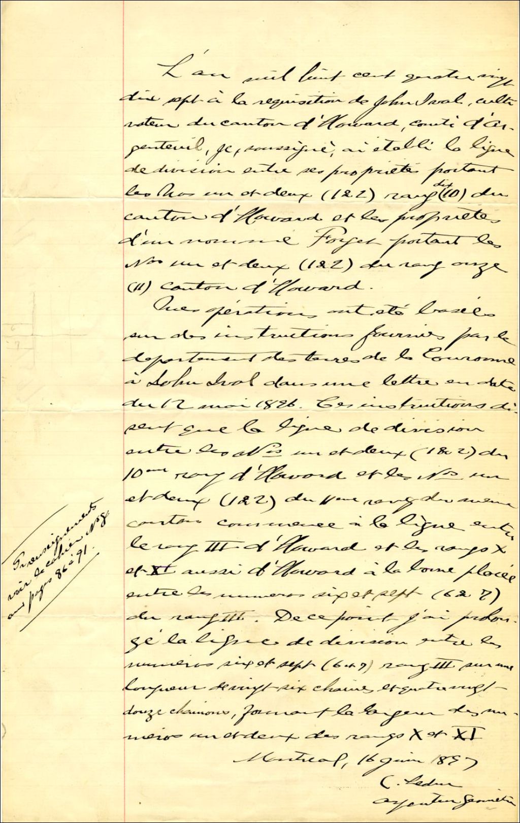 Procès-verbal de bornage, à la requête de John Ival, cultivateur du canton d'Howard, pour établir la ligne de division entre ses propriétés portant les n° 1 et 2 du rang 10 du canton d'Howard et les propriétés d'un dénommé Forget portant les n° 1 et 2 du rang 11 du canton d'Howard, 16 juin 1897, Archives nationales à Montréal, Fonds Cour supérieure. District judiciaire de Montréal. Greffes d'arpenteurs, (06M,CA601,S41,SS1,D8).