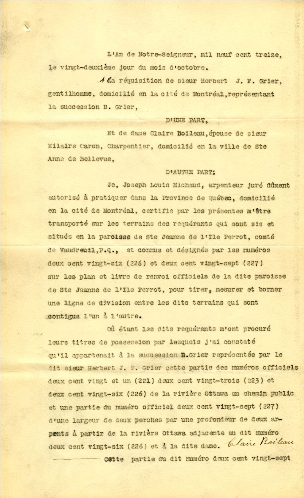 Procès-verbal de bornage, à la requête de Herbert J.F. Grier, de Montréal et représentant la succession B. Grier, et Claire Boileau, épouse de Hilaire Caron, de Sainte-Anne-de-Bellevue, pour établir une ligne de division entre leurs terrains portant les n° 226 et 227 de la paroisse de Sainte-Jeanne-de-l'Île-Perrot, 22 octobre 1913, Archives nationales à Montréal, Fonds Cour supérieure. District judiciaire de Montréal. Greffes d'arpenteurs, (06M,CA601,S47,SS1,D6).