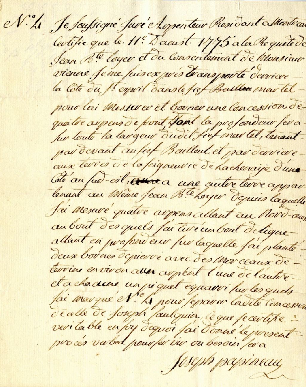 Procès-verbal de mesurage et de bornage, à la suite du consentement de Monsieur Vienne et à la requête de Jean Baptiste Loyer, d'une concession située derrière la Côte du Saint-Esprit dans le fief Martel, seigneurie de Lachenaie, 11 août 1775, Archives nationales à Montréal, Fonds Cour supérieure. District judiciaire de Montréal. Greffes d'arpenteurs, (06M,CA601,S50,SS1,D4).