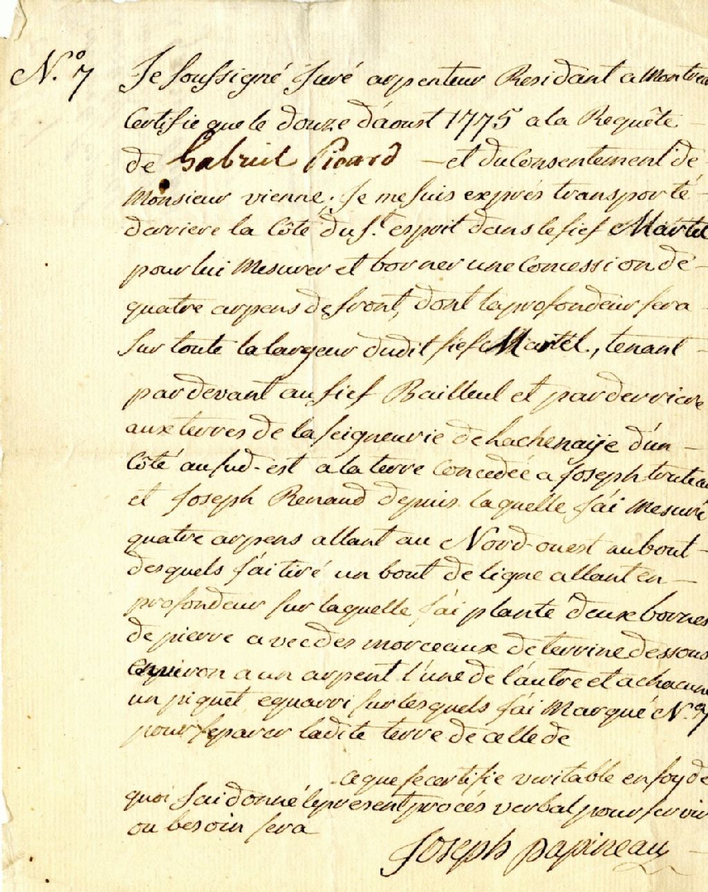 Procès-verbal de mesurage et de bornage, à la suite du consentement de Monsieur Vienne et à la requête de Gabriel Picard, d'une concession située derrière la Côte du Saint-Esprit dans le fief Martel, seigneurie de Lachenaie, 12 août 1775, Archives nationales à Montréal, Fonds Cour supérieure. District judiciaire de Montréal. Greffes d'arpenteurs, (06M,CA601,S50,SS1,D6).