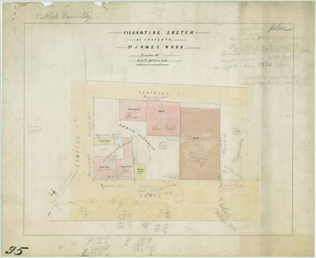 Ce plan présente les lots n° 191 et 192 du cadastre du quartier Saint-Jacques de la cité de Montréal. Ces lots sont situés à l'intersection des rues Craig (devenue Saint-Antoine), Campeau (devenue Saint-André) et Perthius (disparue depuis) à Montréal. Ces lots appartiennent à Patrick Connelly et à la succession de feu Jas. Skelly.Sont localisés un magasin et logement, une boutique et une remise sur le lot de Monsieur Skelly et un édifice à bureaux, une usine, un moulin à bois et une remise sur le lot de Monsieur Connelly. Le voisin est Monsieur Paquette. Des mesures font référence à l'arpenteur Regnaud. Les mesures des lots sont indiquées