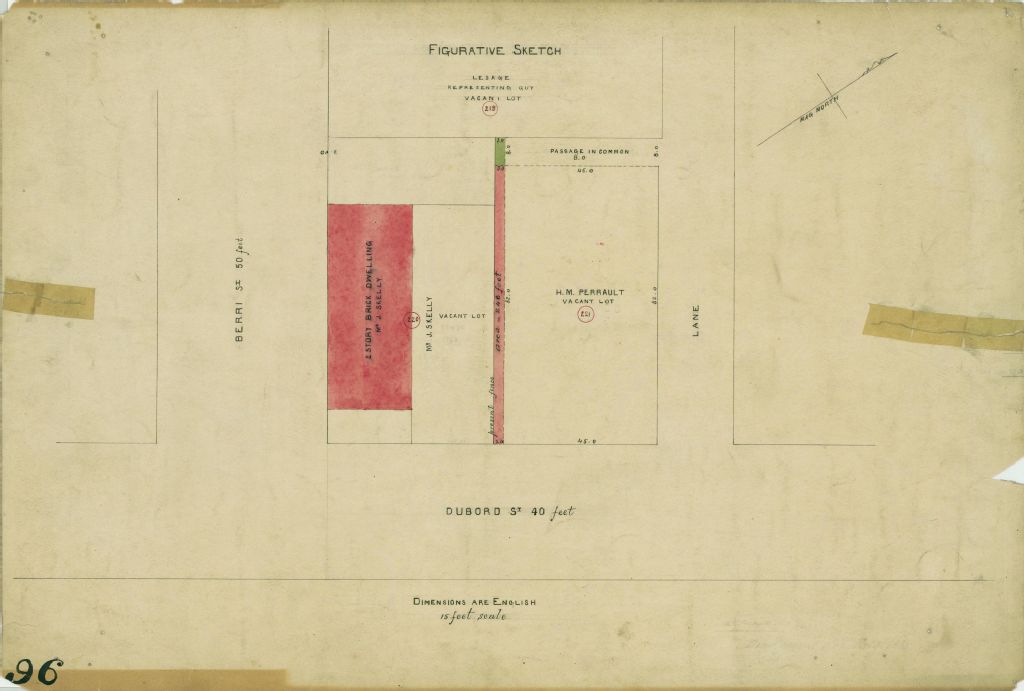 Ce plan présente les lots n° 220 et 221 du cadastre du quartier Saint-Jacques de la cité de Montréal. Ces lot sont situé à l'intersection des rues Dubord (devenue avenue Viger) et Berri à Montréal.Est localisée sur le lot n° 220 appartenant à J. Skelly une résidence de deux étages en brique. Le lot vacant n° 221 appartient à Henri-Maurice Perrault. Le voisin est Monsieur Lesage représentant Guy. Les mesures du lot n° 221 sont indiquées
