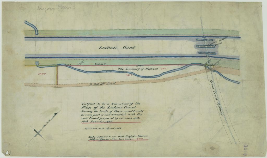 Ce plan présente les lots n° 3409 à 3411 du cadastre de la municipalité de la paroisse de Montréal. Ces lots sont situés entre le Canal Lachine et la rue Saint-Patrick. La petite rivière Saint-Pierre traverse ces lots. Un pont du chemin de fer du Grand Tronc traverse le Canal