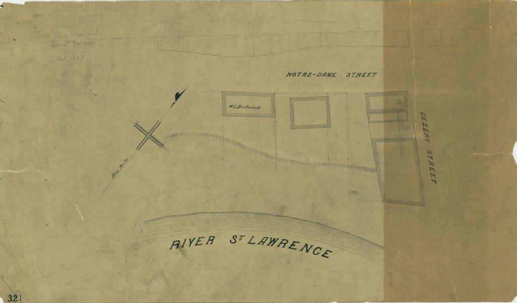 Ce plan présente les lots n° 51 et 52 du cadastre du village de Hochelaga sur l'île de Montréal. Ces lots sont situés à l'intersection des rues Notre-Dame et Dézéry près du fleuve Saint-Laurent à Montréal. Sont localisés sur les lots des édifices divers