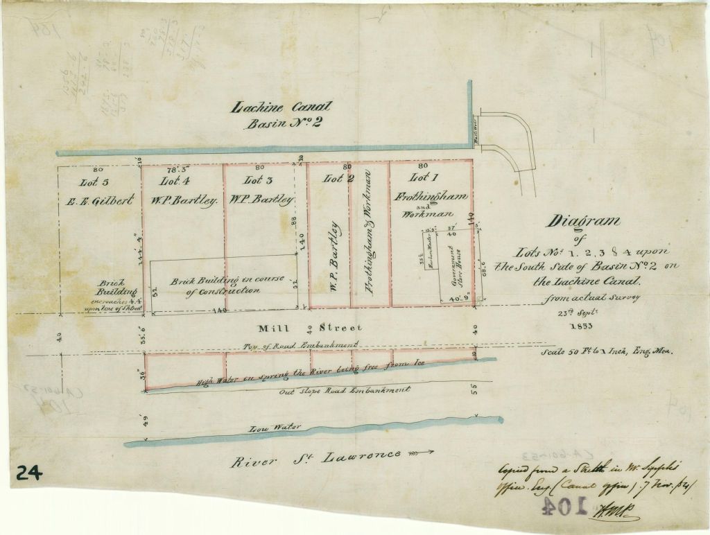 Ce plan présente des lots sur la rue Mill, à l'Ouest du déversoir du Canal Lachine, entre le bassin n° 2 du canal et le fleuve Saint-Laurent. C'est le lot n° 326 du cadastre du quartier Sainte-Anne de la cité de Montréal. Le plan montre un édifice du gouvernement avec, attenant, les bureaux du capitaine du port, un édifice en brique en construction et un autre construit avec emprise sur la rue Mill. Les propriétaires des lots sont Messieurs Frotingham & Workman, W. P. Bartley et E. E. Gilbert