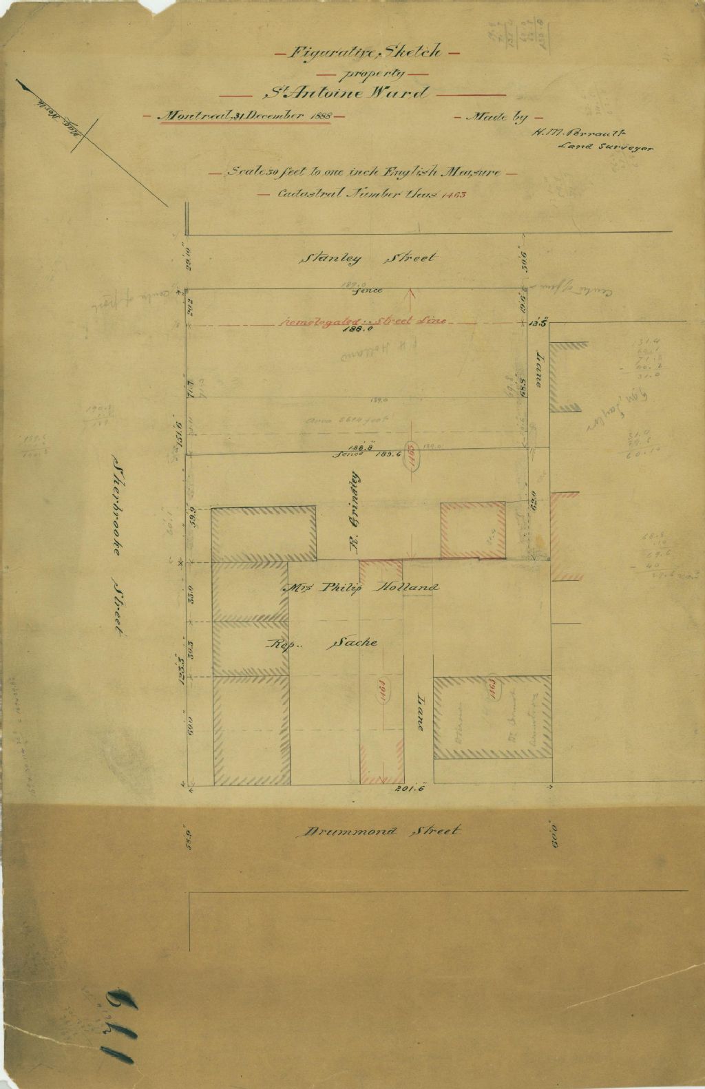 Ce plan présente les lots n° 1463 à 1465 du cadastre du quartier Saint-Antoine de la cité de Montréal. Le lot n° 1463 appartient à Robert Grindley et les autres lots sont la propriété de madame Philip Holland représentant Monsieur Sache. Ces lots sont situés sur la rue Sherbrooke entre les rues Stanley et Drummond à Montréal.Sont localisés sur les lots des édifices divers. Une partie du lot n° 1463 est homologuée afin de permettre l'agrandissement de la rue Stanley. Les mesures des lots sont indiquées