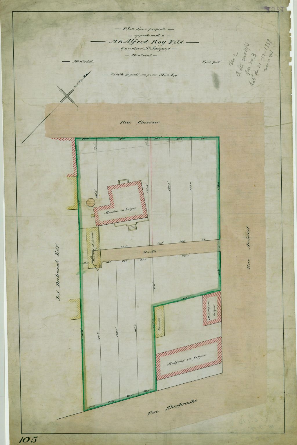 Plan d'une propriété appartenant à Mr. Alfred Roy fils Quartier St-Jacques Montréal