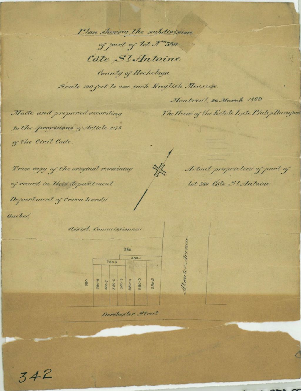 Ce plan présente une partie du lot n° 380 de la municipalité de la paroisse de Montréal. Ce lot appartient aux héritiers de feu Philip Durnford. Ces lotissements sont situés à l'intersection des rues Dorchester et Atwater à Westmount. Une note indique qu'une copie de ce plan se trouve au Département des Terres de la Couronne à Québec