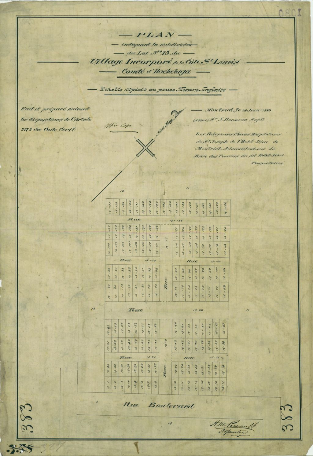 Plan indiquant la subdivision du Lot no 15 du Village Incorporé de la Cote St Louis Comté d'Hochelaga